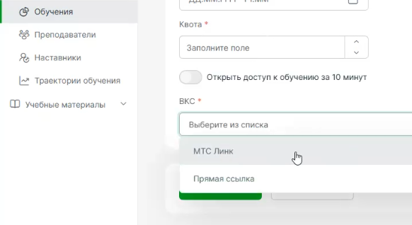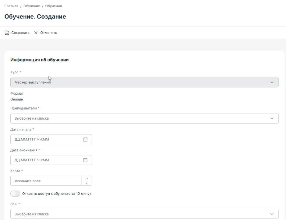 После публикации курса появляется возможность указать дату проведения онлайн-обучения. Нажмите внизу страницы "Создать обучение"