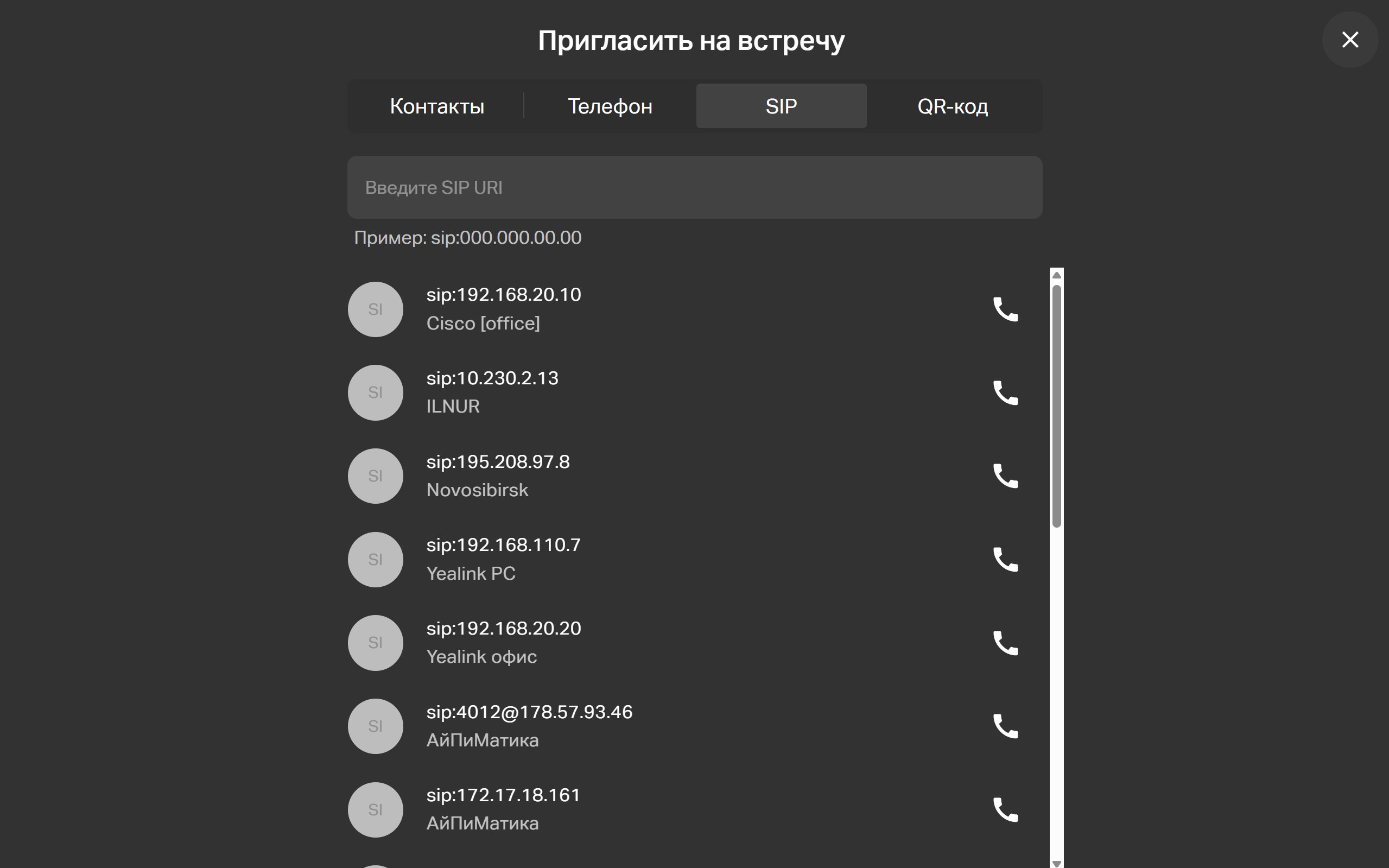 Во вкладке "SIP" вы можете позвонить на любое SIP-устройство, заведённое в вашей организации на платформе МТС Линк.