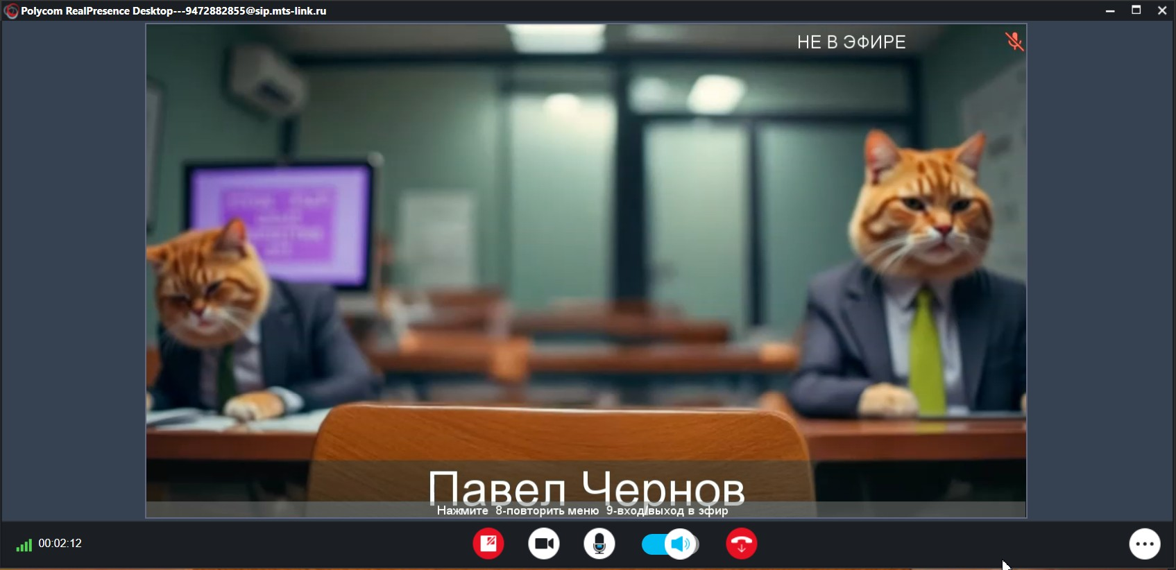 3. Пример: отключен микрофон, включена транскрибация, SIP участник в эфире встречи с авто-выходом в эфир (т.к. в меню нет возможности покинуть эфир)