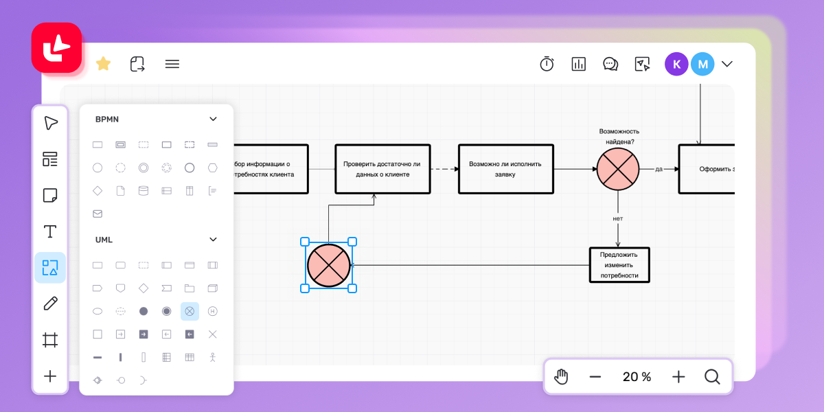 В Досках можно создавать профессиональные BPMN и UML диаграммы.