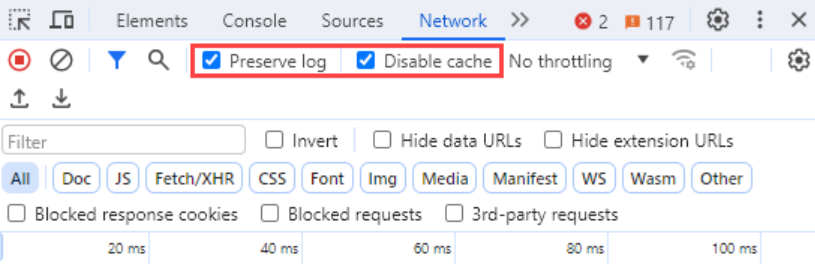 - Установите флажки Сохранить журнал и Отключить кэш.