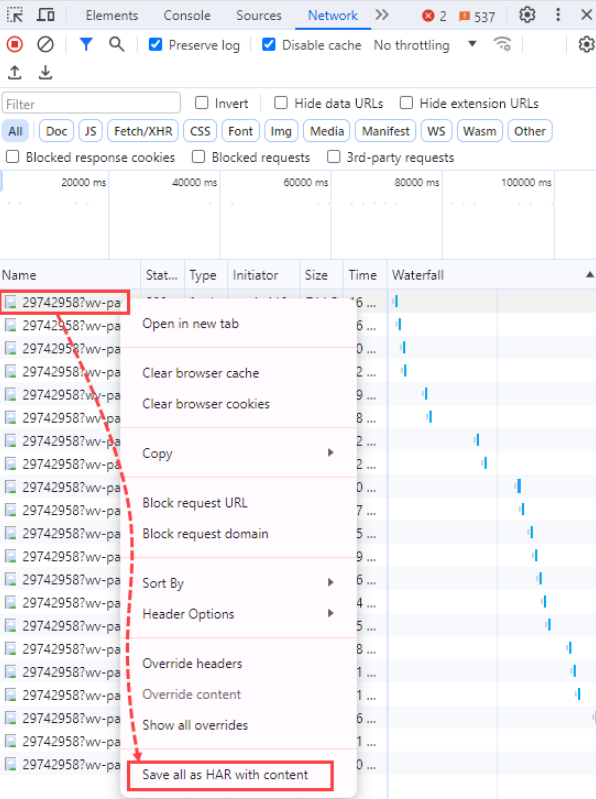 6. Щелкните правой кнопкой мыши по любому журналу и выберите Сохранить все как HAR с содержимым .