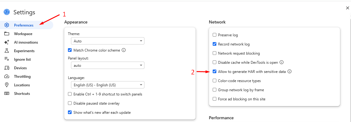 3. В настройках откройте Preferences. Найдите раздел Network и поставьте галочку Allow to generate HAR with sensitive data. И закройте вкладку настроек