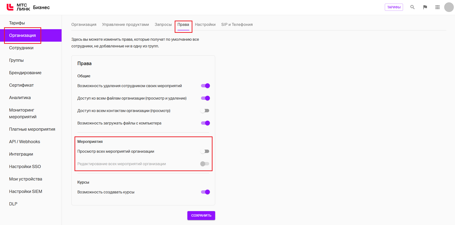 Для предоставления прав Администратора мероприятий всем сотрудникам Организации необходимо в личном кабинете Администратора Организации на вкладке "Права" раздела "Организация" в блоке "Мероприятия" (данный блок появится после активации функционала) поочередно включить два тумблера — "Просмотр всех мероприятий организации" и "Редактирование всех мероприятий организации" и нажать на кнопку "Сохранить":