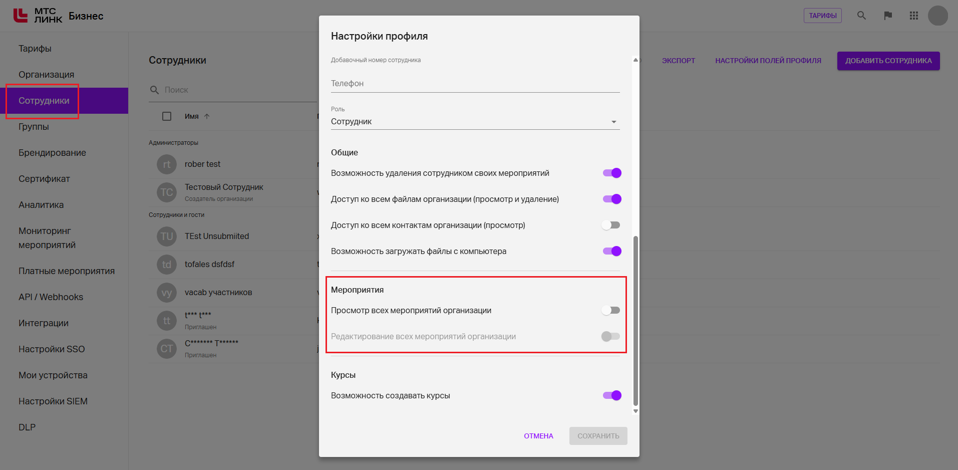 Примечание: здесь и далее при выключенном тумблере "Просмотр всех мероприятий организации" тумблер "Редактирование всех мероприятий организации" будет заблокирован, а если включить первый тумблер, то сотрудники смогут только просматривать чужие мероприятия без возможности их проведения с правами Администратора.