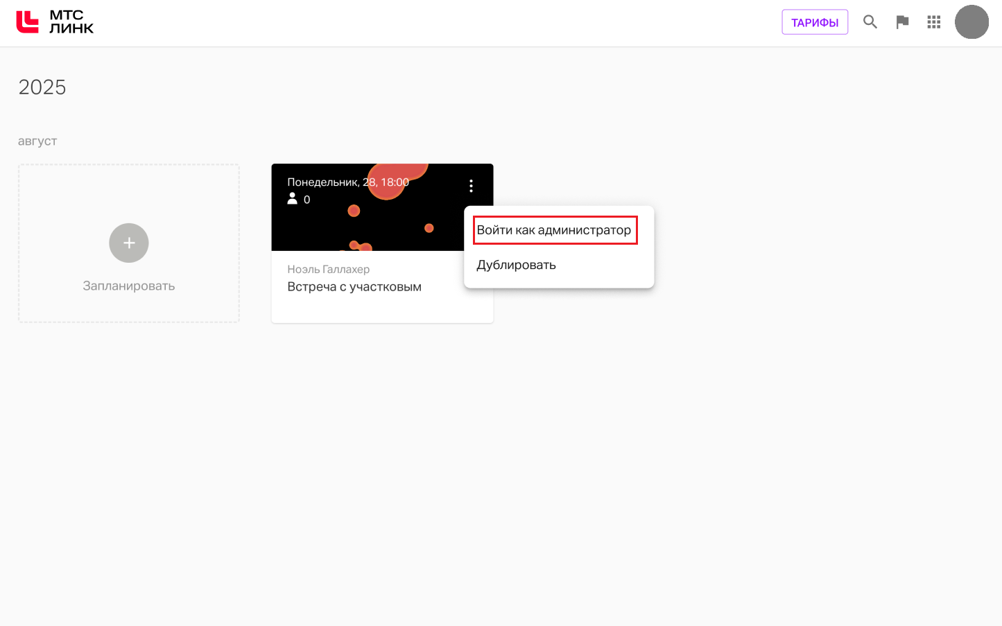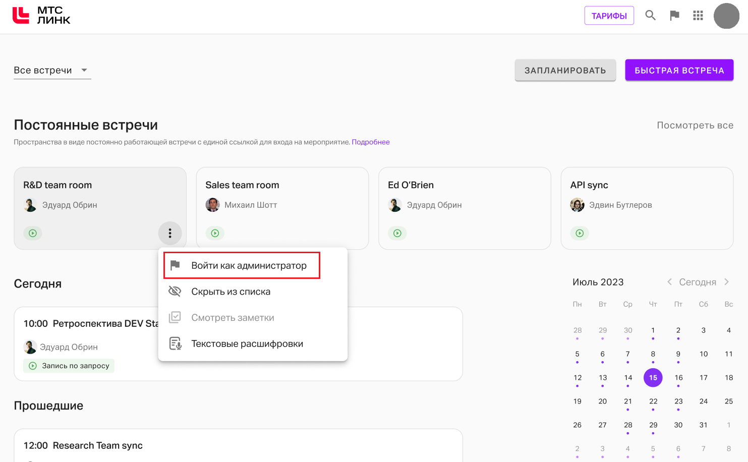 Во всех трех вариантах после выполнения настроек в контекстном меню встреч/вебинаров в личном кабинете сотрудников, которым были предоставлены права Администратора мероприятий, появится опция "Войти как администратор".