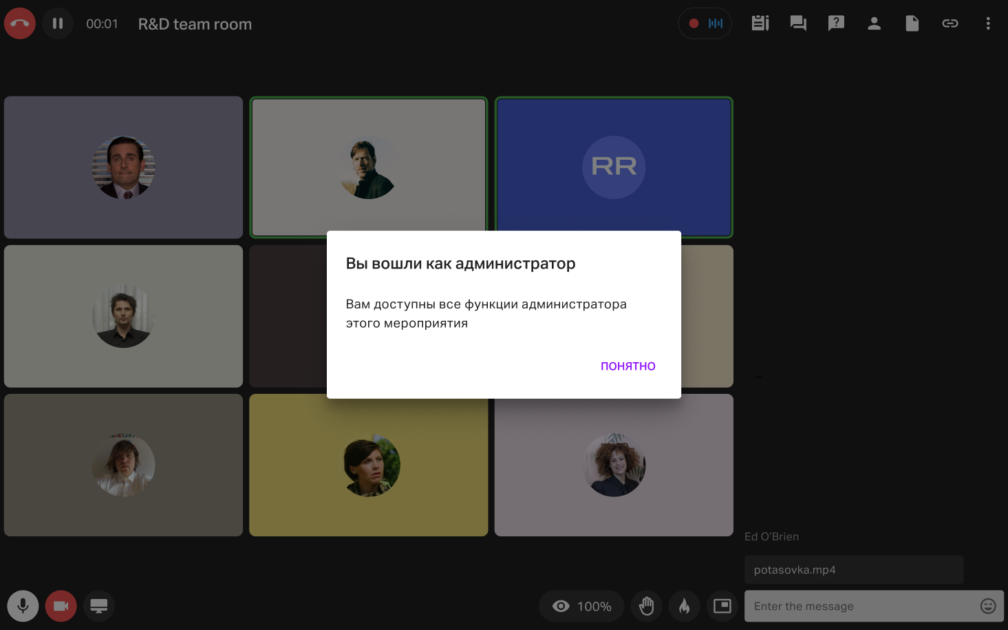 Нажав на "Войти как администратор", пользователь попадет в комнату мероприятия, получит соответствующее уведомление и сможет запустить мероприятие (если оно еще не началось автоматически) и провести его с правами Администратора: