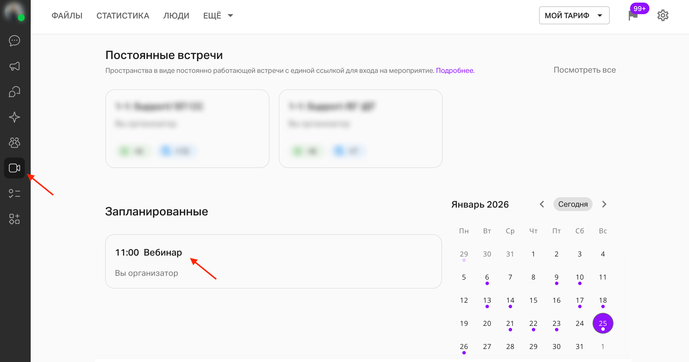 1. Находясь на главной странице личного кабинета (раздел встречи), нажмите на необходимое мероприятие: