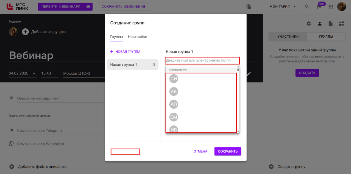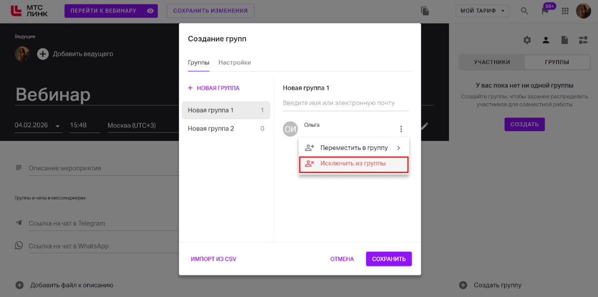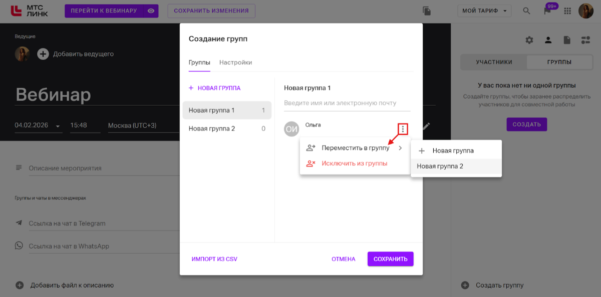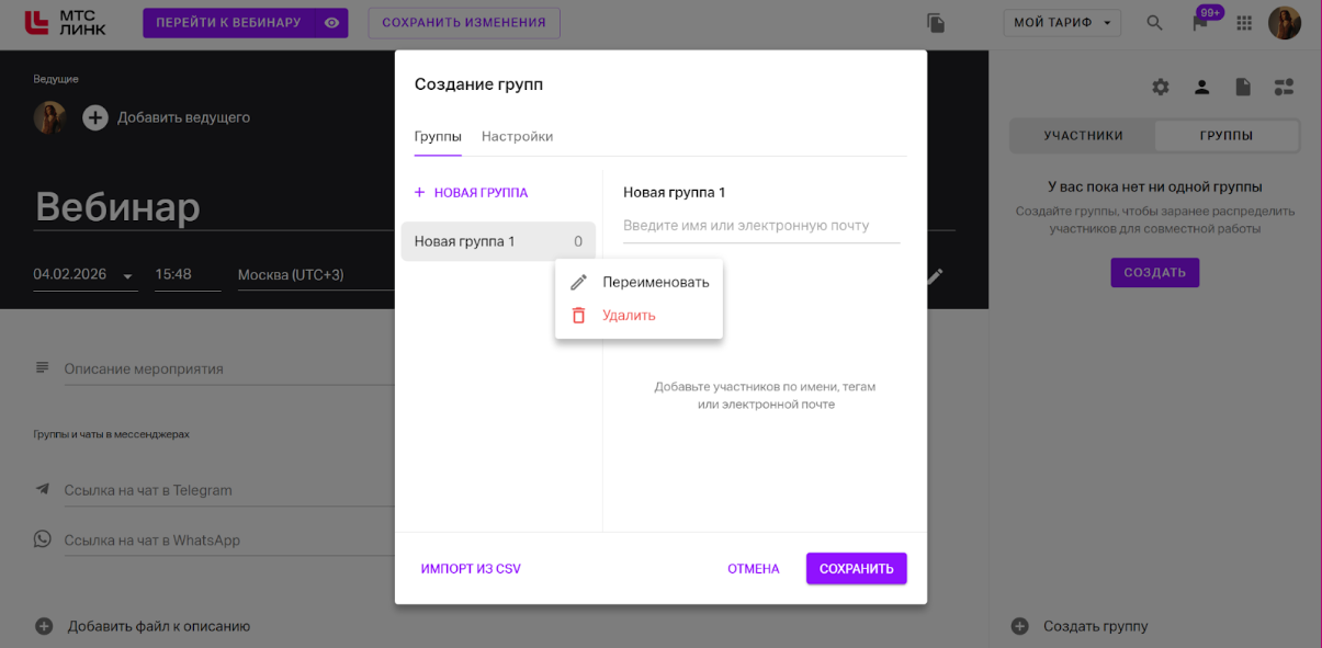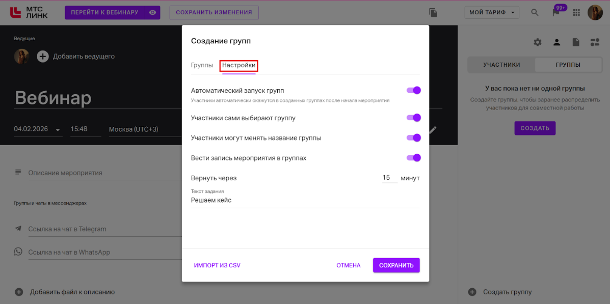 Функционал «Группы» позволяет создавать отдельные комнаты внутри вашего мероприятия для обсуждений и практических заданий. Управлять группами можно до начала или прямо во время мероприятия.