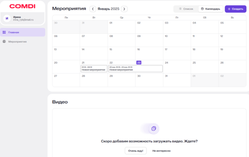 После этого вы попадёте в личный кабинет организатора – страницу со списком мероприятий (можно переключаться между календарным и списочным видом событий).