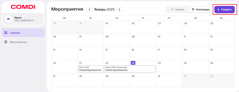 На странице списка мероприятий нажмите кнопку «Создать».