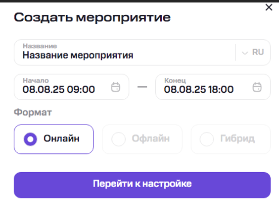 Укажите название события, дату и время начала/окончания, а также формат (онлайн/оффлайн/гибрид) и нажмите «Перейти к настройке».
