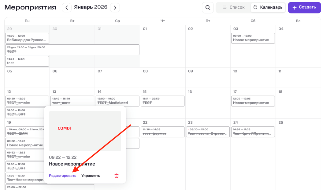 Чтобы перейти к настройкам ранее созданного мероприятия, нажмите на мероприятие в списке мероприятий и выберите кнопку «Редактировать»: