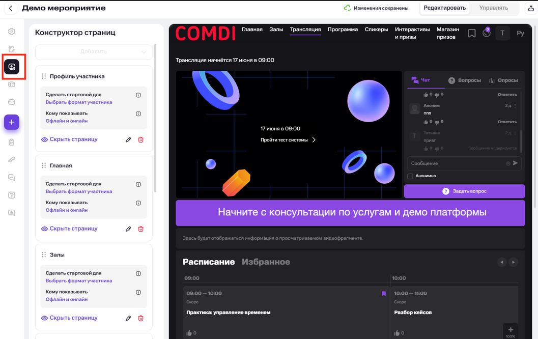 Перейдя в раздел «Конструктор страниц», вы можете дополнительно настроить внешний вид для каждой страницы мероприятия на платформе: