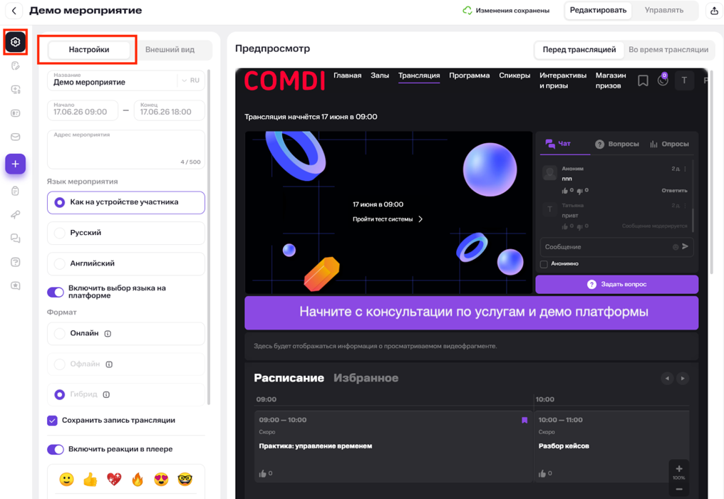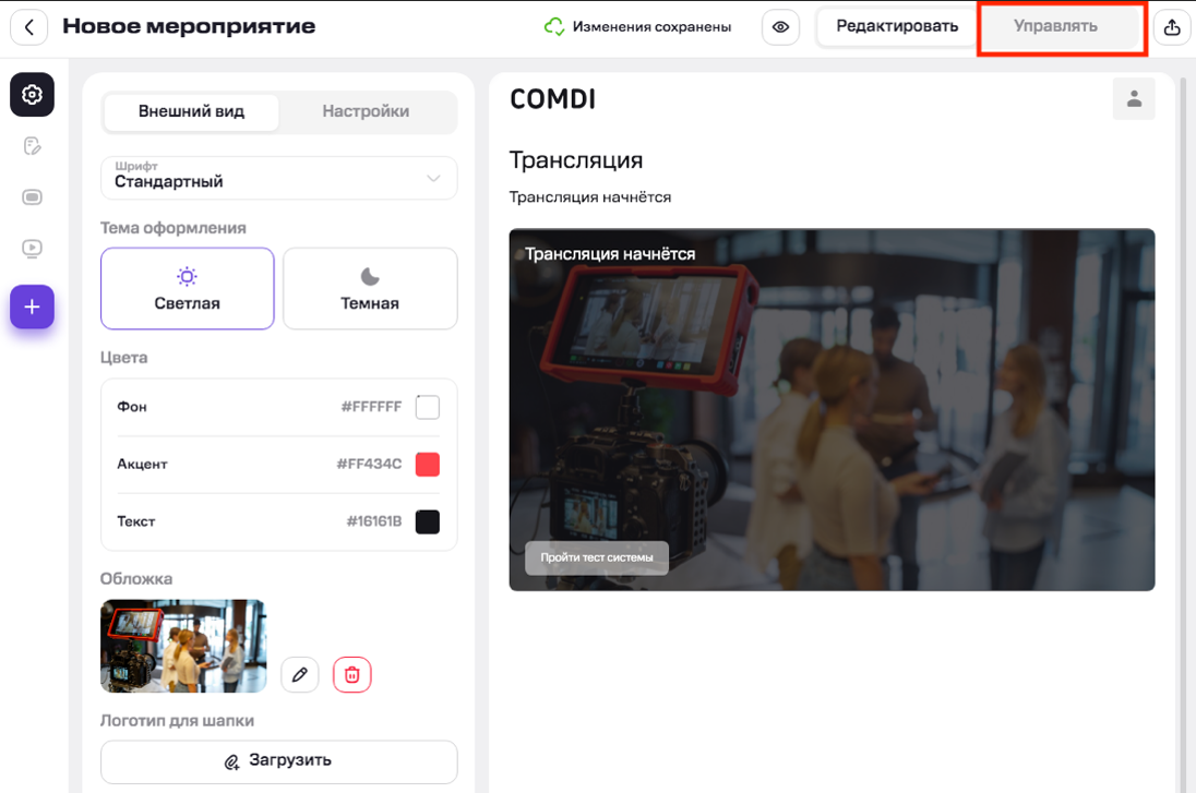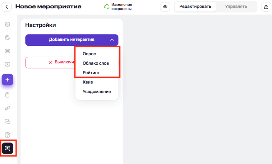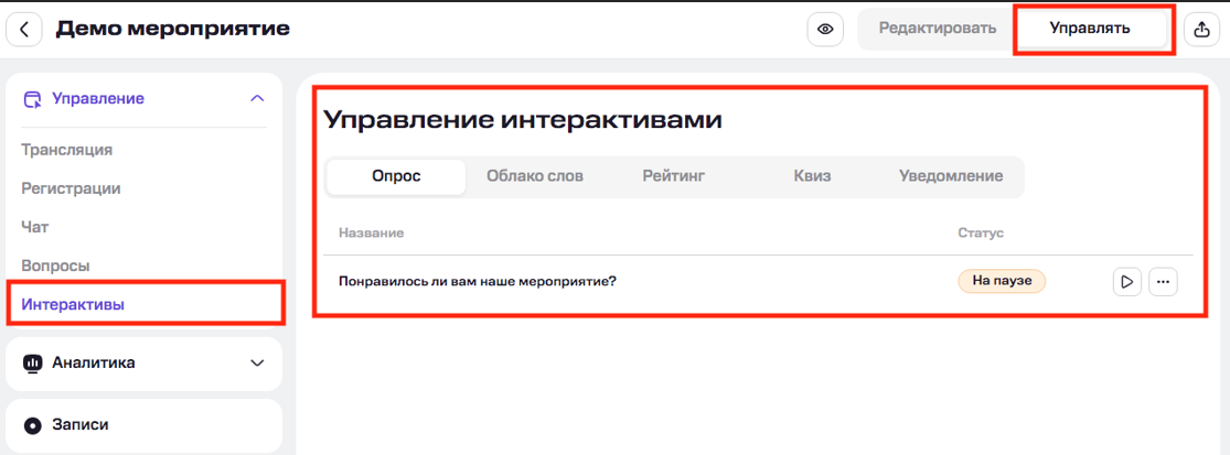 Для управления опросами, квизами и уведомлениями нажмите «Управлять» на странице мероприятия (справа вверху). В режиме управления доступны функции: