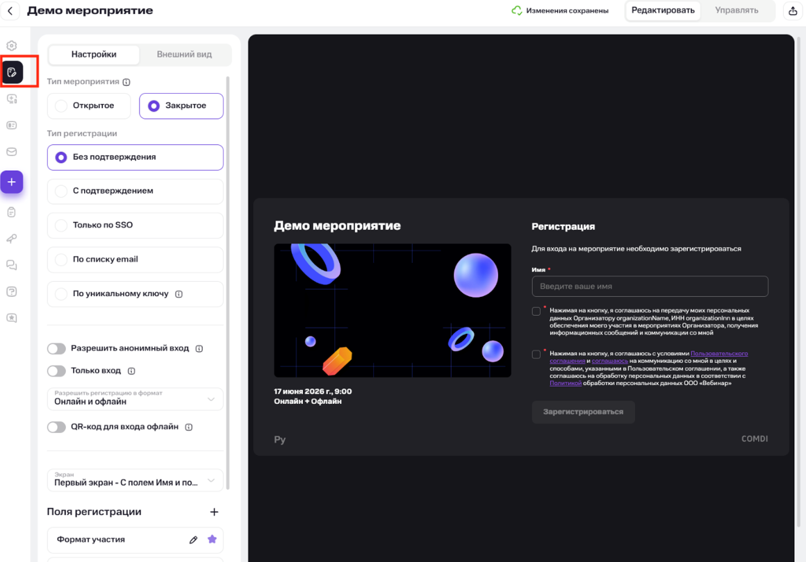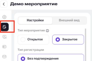 Чтобы перейти к настройкам регистрации, выберите иконку редактирования в левой панели.
