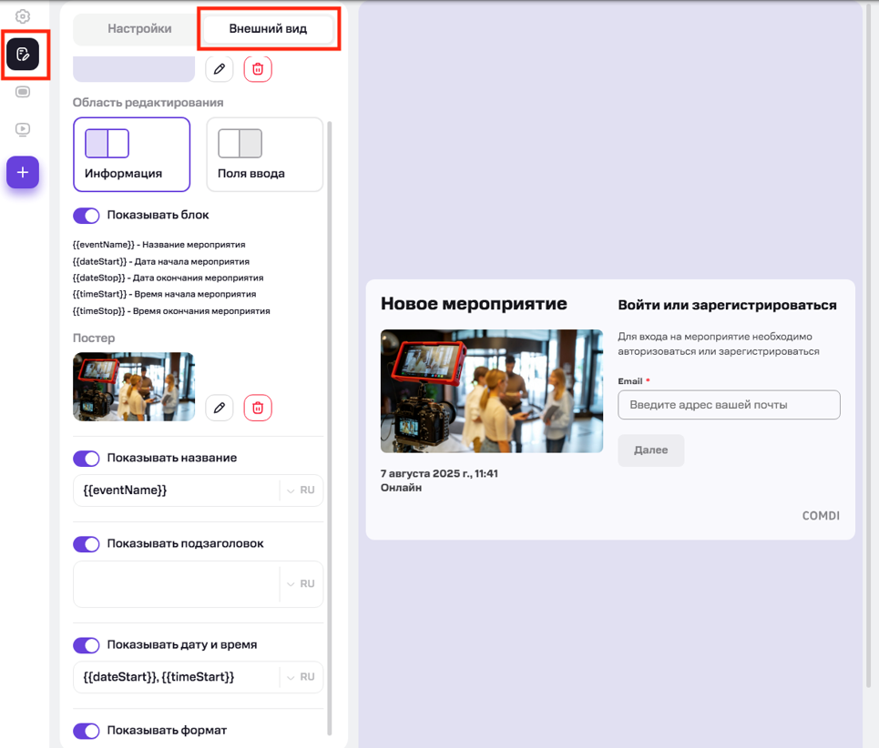 В разделе «Внешний вид» вы можете полностью брендировать страницу события по корпоративным стандартам. Доступны следующие параметры: