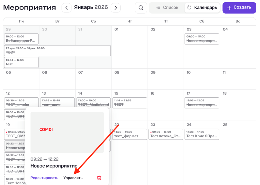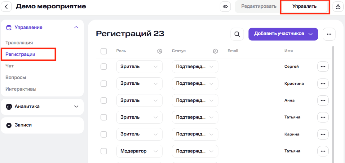 Для управления списком зарегистрированных участников нажмите «Управлять» в правом верхнем углу мероприятия. Или на странице со списком мероприятий найдите нужное мероприятие и нажмите на него, затем выберите «Управлять».