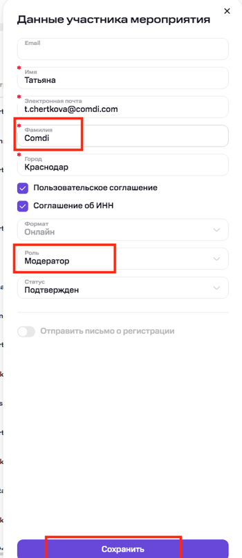 Чтобы назначить роль, в списке регистрации нажмите «Редактировать» напротив участника, смените поле «Роль» на «Модератор» и сохраните изменения. После этого все его сообщения в чате и раздел «Вопросы» будут помечаться меткой «Модератор» для удобной идентификации другими участниками.
