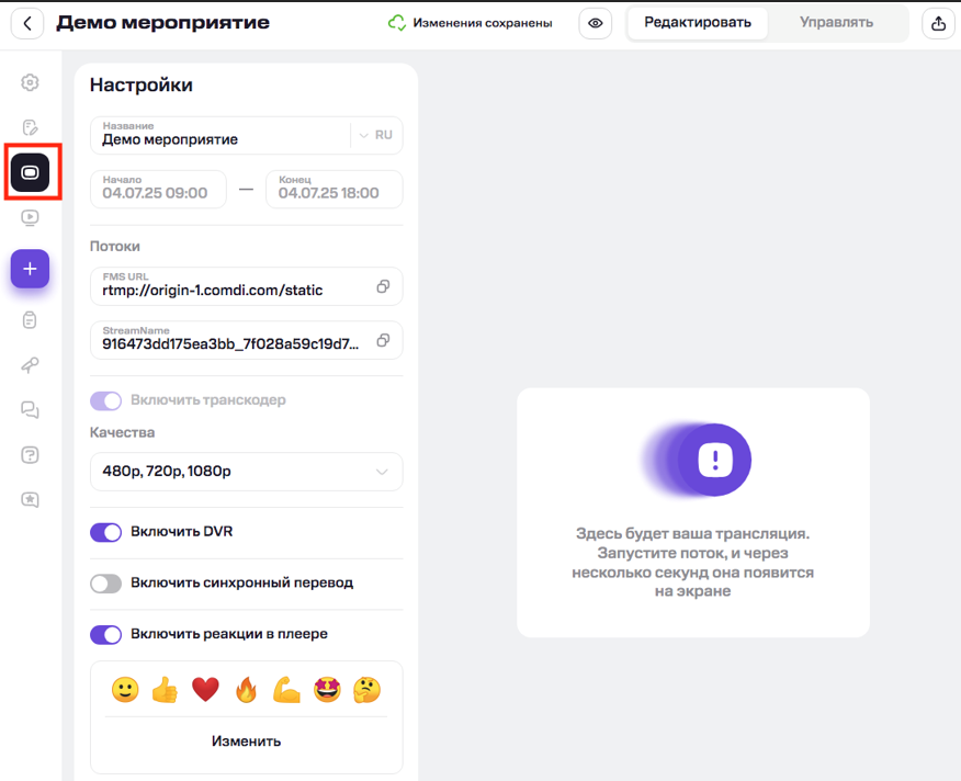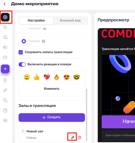 Чтобы открыть настройки трансляции, перейдите в «Основные настройки» → «Залы и трансляции» → нажмите иконку редактирования в нужном зале → выберите «Настройки трансляции».