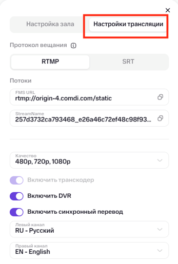 Во вкладке «Настройки трансляции» доступны следующие параметры: