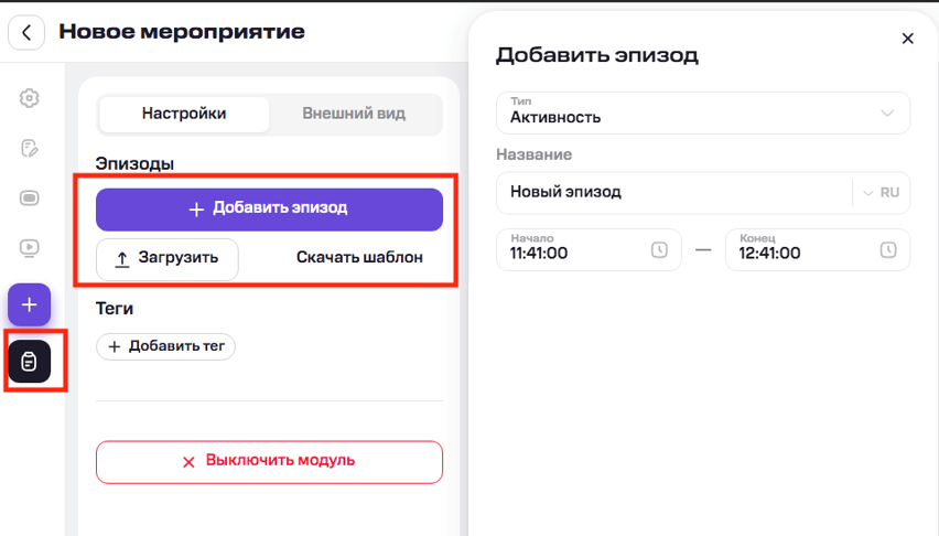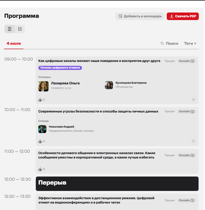 Блок с расписанием эпизодов мероприятия. Отображает тайминги выступлений, темы докладов и другую информацию для зрителей на внешнем сайте.