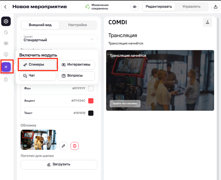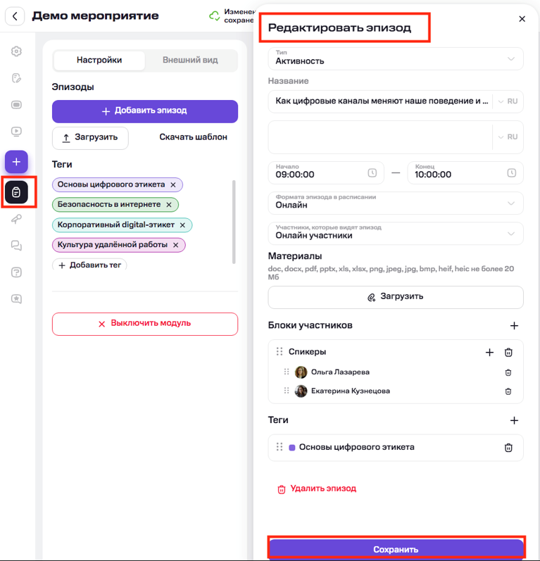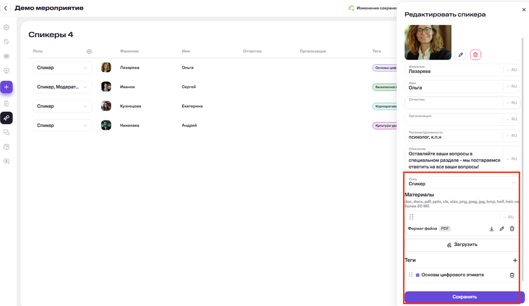 Подробнее про включение модуля «Спикеры» и добавление спикеров