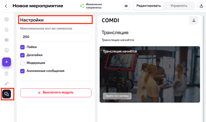 Для управления чатом в режиме реального времени нажмите «Управлять» вверху справа на странице мероприятия. В режиме управления доступны функции: