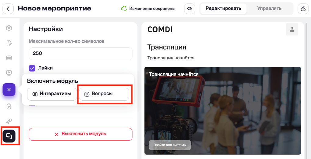 Модуль «Вопросы» позволяет участникам задавать вопросы организаторам и спикерам во время мероприятия. Это способствует активному вовлечению аудитории и сбору обратной связи.
