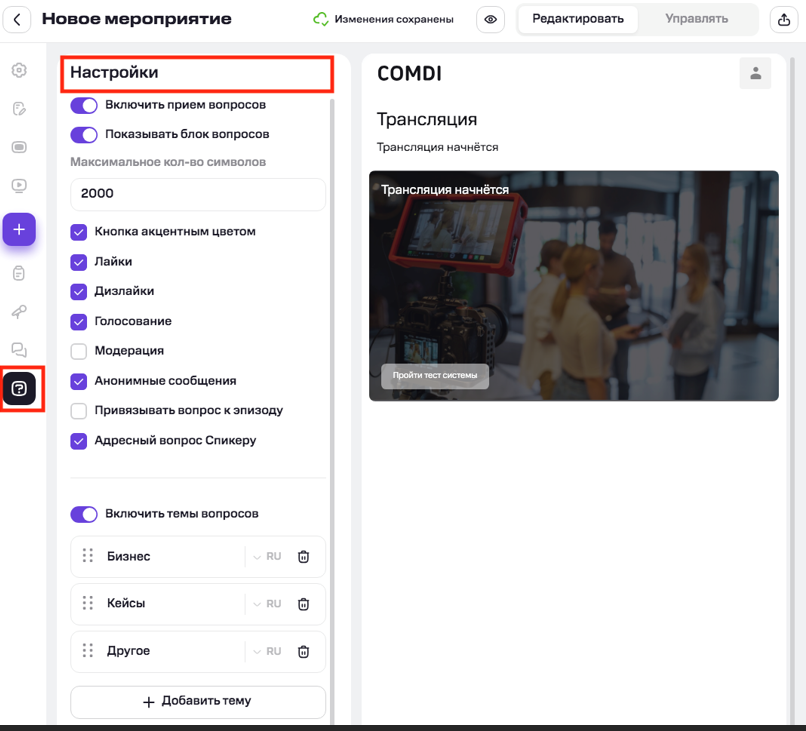 Темы для вопросов: организатор может создать несколько тем (категорий) и потребовать от участников выбирать тему при отправке. Это упорядочивает вопросы и облегчает их фильтрацию.