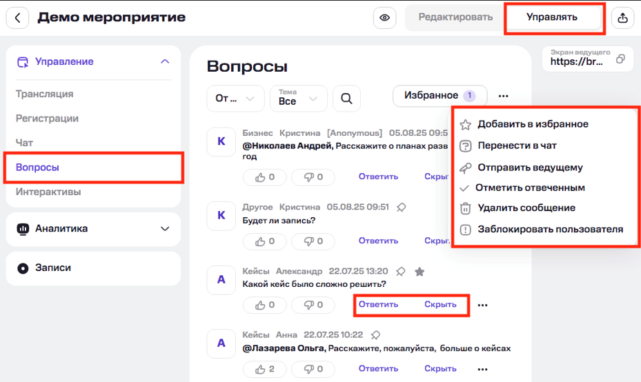 Нажмите «Управлять» на странице мероприятия, чтобы перейти в режим модерации вопросов. Доступны функции: