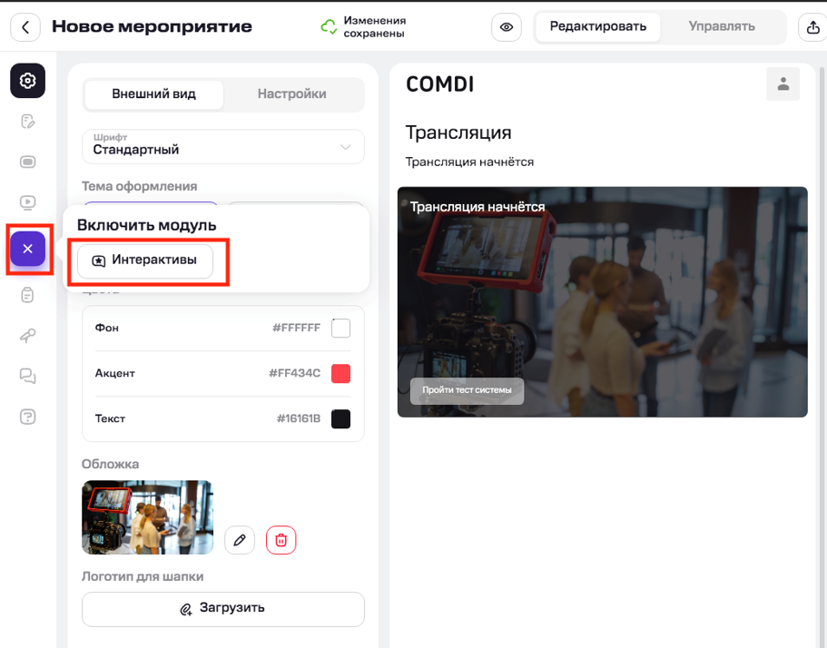 Чтобы активировать модуль, нажмите иконку + «Интерактивы» на левой панели и выберите «Интерактивы».