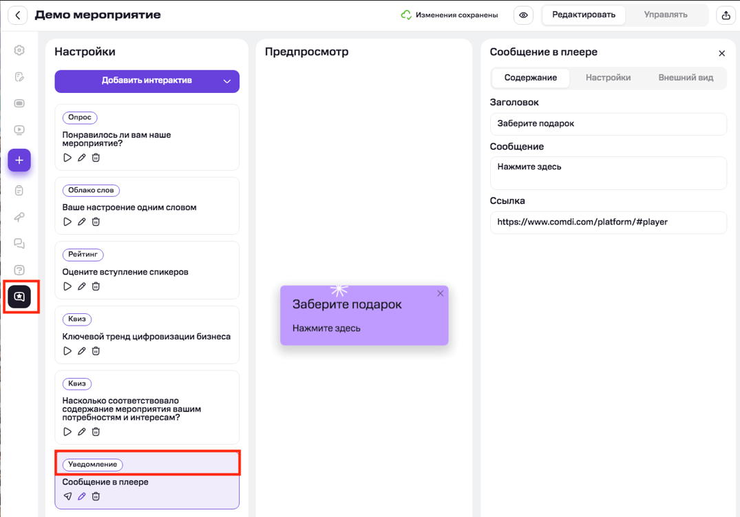 После нажатия «Добавить интерактив» → «Уведомление» выберите иконку «Редактировать», внесите заголовок и текст, укажите при необходимости ссылку и сохраните.