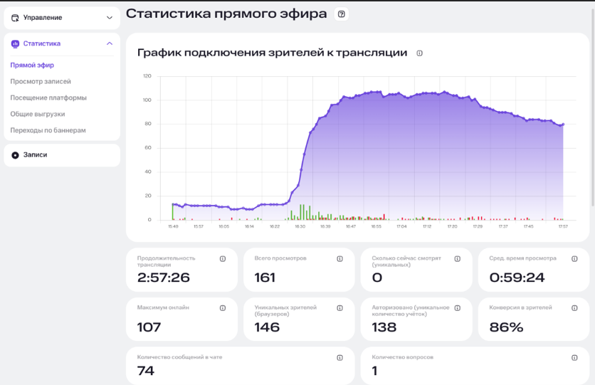 Всю длительность, указанную в настройках мероприятия, платформа считает «прямым эфиром». Даже если трансляция фактически не велась некоторую часть этого времени, все просмотры до конца указанного периода засчитываются как эфир. Если зритель начал смотреть до завершения эфира и продолжал после окончания, часть просмотра относится к прямому эфиру, часть – к просмотру записи. Рекомендуется установить время работы зала на 1–2 часа дольше реального эфира, чтобы корректно учесть все просмотры.