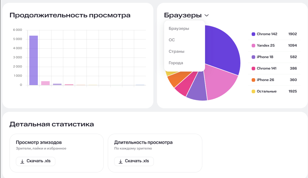 По эпизодам. Показывает по каждому эпизоду количество просмотров, уникальных зрителей, лайков и добавлений в избранное.