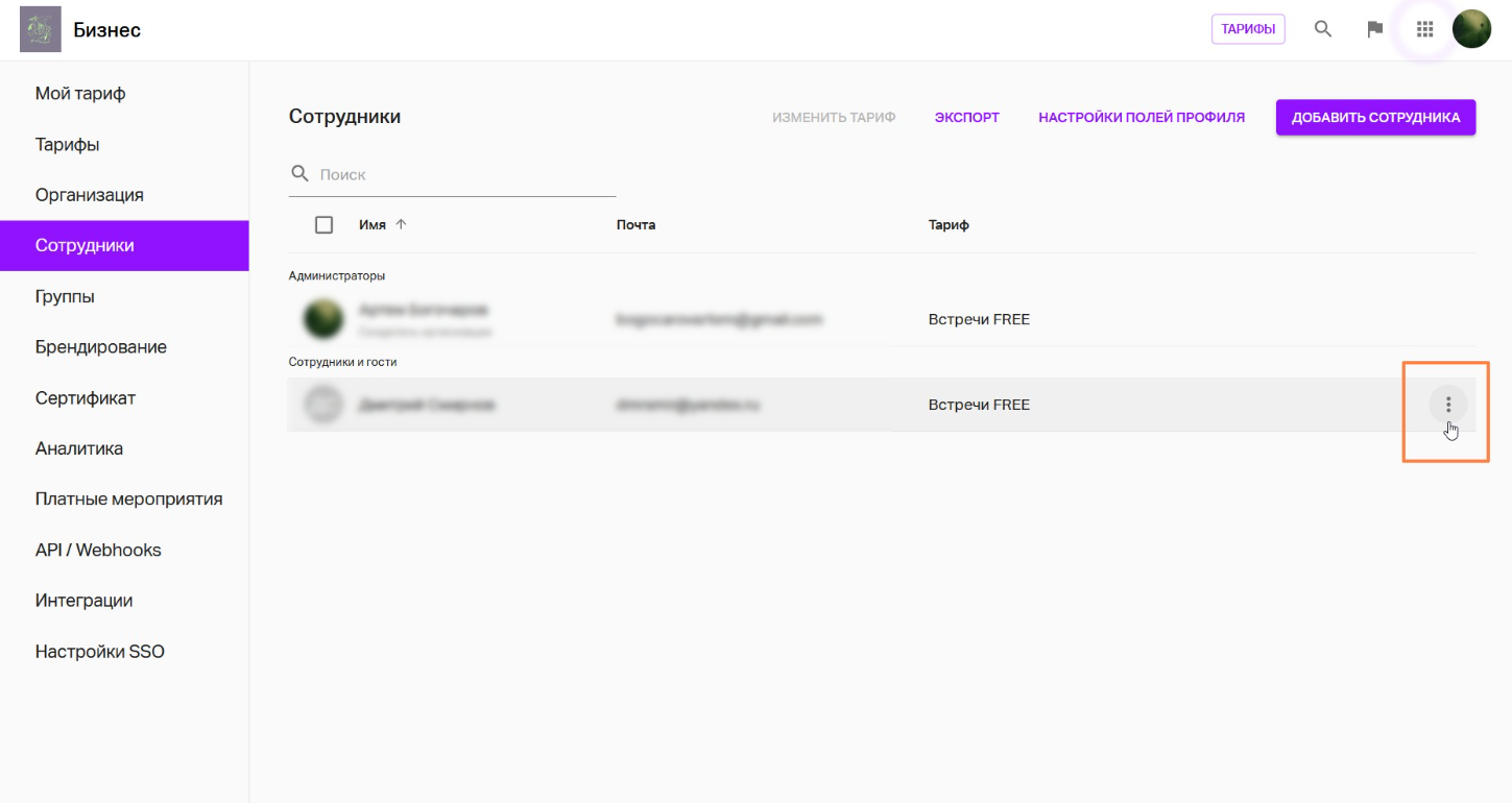 2) Справа от имени сотрудника, данные которого вы хотите передать, нажмите на три точки и выберите «Перенос данных»