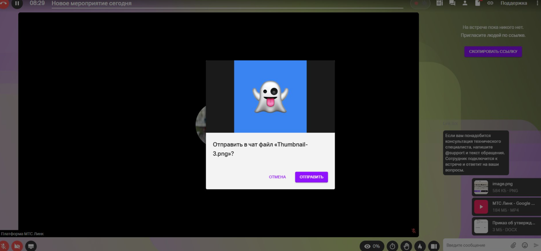 Если вы находитесь во встрече и хотите поделиться с участниками файлом, достаточно скопировать его с помощью Ctrl+C и вставить прямо в чат комбинацией клавиш Ctrl+V.