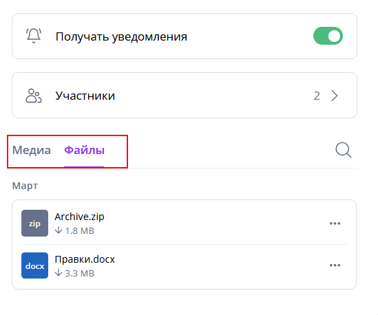 Во вкладках «Медиа», «Файлы», «Ссылки» — находится всё, что отправлялось участниками.