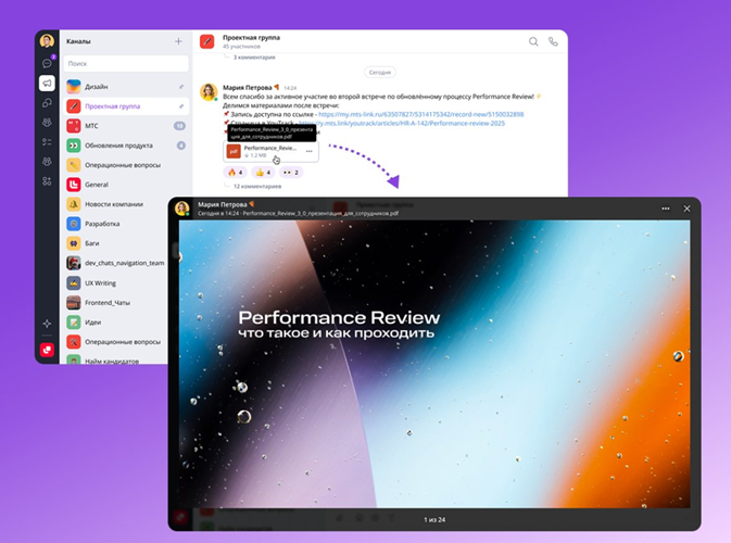 Не выходя из чата, вы можете просматривать сканы, отчёты, инструкции, технические задания и презентации. В открытых pdf легко выделять и копировать нужный фрагмент, после чего его можно вставить в любой редактор или переслать коллегам.