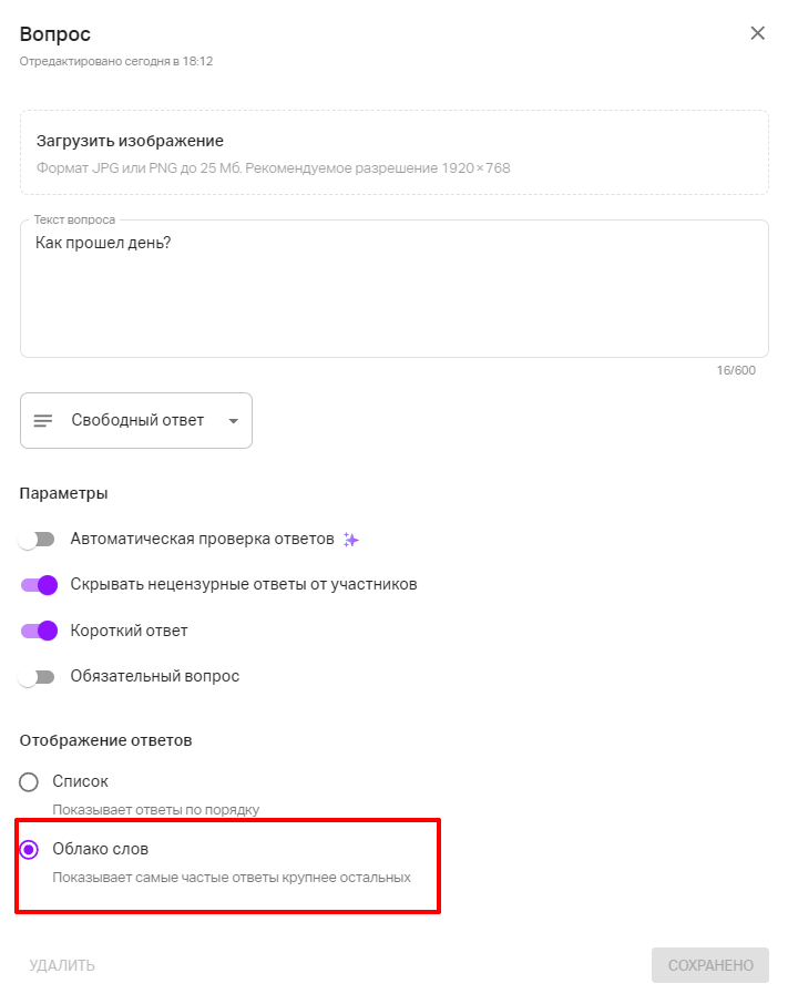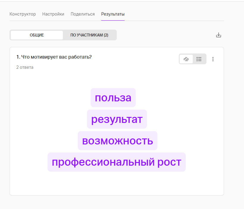 Этот формат автоматически обрабатывает все текстовые ответы и превращает их в наглядную картинку: чем чаще встречается слово, тем крупнее оно отображается в облаке.